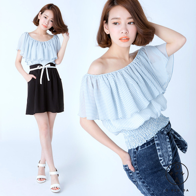 ORENDA-荷葉雪紡條紋縮腰上衣-S.M-藍白條