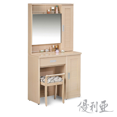 優利亞-普羅甜心 2.7尺化妝台+椅(2色可選) 【優利亞-普羅甜心】2.7尺化妝台+椅(2色可選)~此款化妝台共有胡桃、白橡2款色系可供選擇,可依照居家空間設計選購喜好的色系;且此款設計上層鏡架採用掀開鏡面設計,可放置化妝品等物品,上下層右側為隱藏式置物空間格,均附一個隔板;下方左側為抽屜式設計,可放私人小物品,特別針對居家空間狹小族群所推出,不用擔心空間使用的問題;而此款簡約式現代線條飾條造型,帶有低調時尚的設計感,讓您的臥室環境增添質感!而此款化妝台100?由台灣製造,非DIY組裝設計,品質有保障。