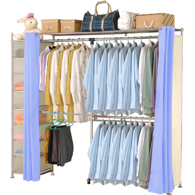 超大伸縮尺寸,衣服吊桿上部採用3公分硬質鋼材(可伸縮),可容納約150件衣服(視衣服大小)。衣服吊桿下部採用2.5公分硬質鋼材(可伸縮),可容納約150件衣服(視衣服大小)。衣櫥共可懸掛300件大大小小的衣服,吊多件衣服也不會變形。衣櫥內部下方可放行李箱或收納箱,充份利用空間。衣架頂端附有網片層架,可置放收納整理盒或棉被。底部採大H型調整腳,四平八穩,不用擔心搖晃。搭配不織布布簾,美觀大方。