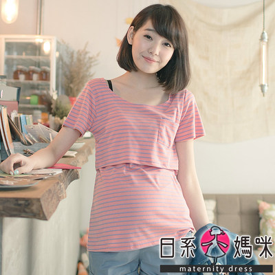 日系小媽咪孕婦裝。台灣製哺乳衣~配色細條紋上衣 (共五色)