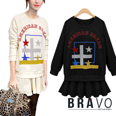 星星印花假兩件荷葉裙襬棉質洋裝 共二色 Bravo