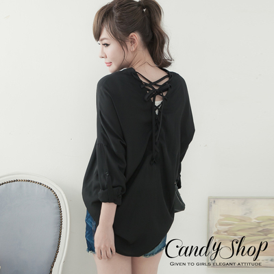 CANDY小舖 美背交叉綁帶男友寬版雪紡襯衫(黑色)