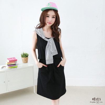 糖罐子-附條紋披肩綁帶抽繩口袋背心洋裝(共二色)
