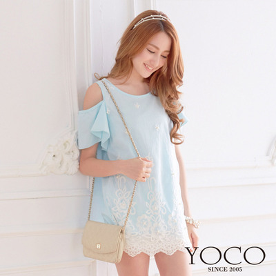 東京著衣-YOCO 綴珠繡花網紗露肩棉麻上衣-S.M(共一色)-4016552