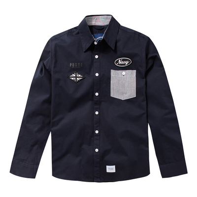 CACO - NAVY?徽章條紋拼接長袖襯衫 (共兩色)