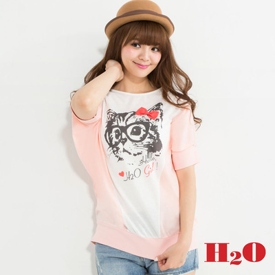 H2O-貓咪圖案連袖上衣(粉紅色)