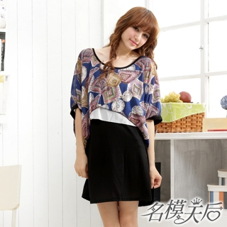 【名模天后中大碼】假兩件古典風圖印造型洋裝(藍)