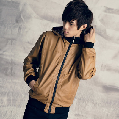 小猴子的賣場 韓版質感皮革內裡條紋造型連帽軍風騎士皮革夾克-二色商品網址: