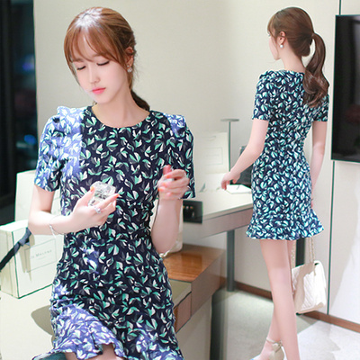樹葉圓領短袖包臀波浪裙擺洋裝(海軍藍) SZ by SZ