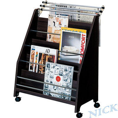 前兩輪採煞車式的滾輪設計,可輕鬆移動,不佔空間。也能定點固定,不隨處滑動。整體採用美耐敏板材,表面防水耐高溫,附壓克力掛勾、三支圓形鋁製報夾。有效的收納,多種規格書籍、雜誌、報紙,公司行號及居家均適用。