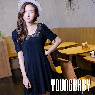 【YOUNGBABY中大碼】金色亮片假圓領胸腰線內移袖抓折顯瘦洋裝(黑)