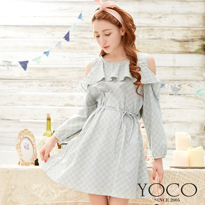 東京著衣-YOCO 格紋挖肩荷葉領綁帶洋裝-S.M(共二色)-4007100