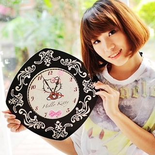 【MAY SHOP】Hello Kitty凱蒂貓黑色巴洛克花紋菱形掛鐘時鐘