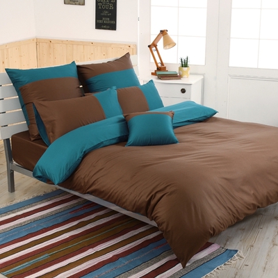LITA麗塔(魔術方塊-焦茶x土耳其藍)雙人加大四件式純棉薄被套床包組