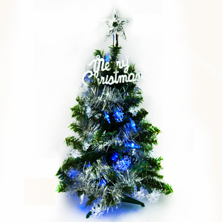 ※本商品出貨包括一株2尺一般型PVC綠色聖誕樹+如圖搭配之裝飾配件 (Merry Christmas英文字牌 +樹頂星+金蔥彩條) +一組50燈LED雪花造型燈串 (藍白光燈)(此為插電式燈串)