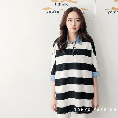東京著衣 橫條紋牛仔袖寬版T(共二色)