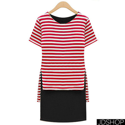 周董的店-橫條紋假兩件式連身裙(共三色)