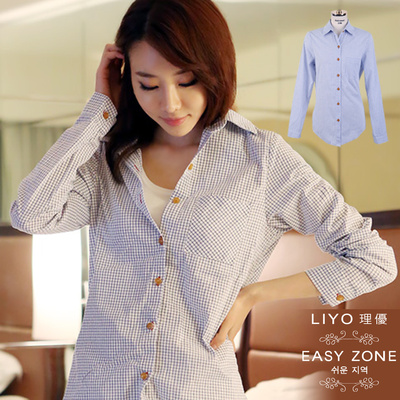 LIYO理優 藍色細格鈕釦裝飾長袖襯衫 525 S-L