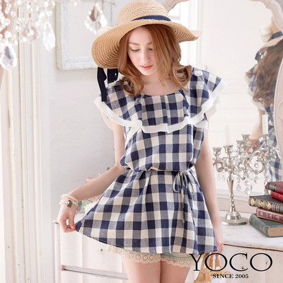 東京著衣-YOCO 荷葉領格紋綁帶上衣-S.M.L(共一色)