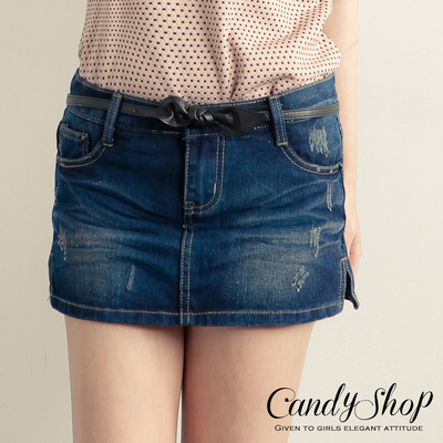 CANDY小舖 黑色鉚釘抓破深藍刷白小貓抓牛仔褲裙
