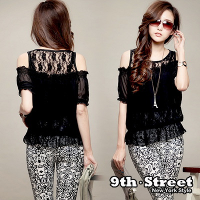 9th Street 法式香氛蕾絲美肌荷葉滾邊雪紡上衣商品網址: