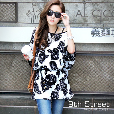 9th Street 玫瑰圖騰露肩長版上衣