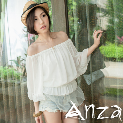 一字伸縮領寬袖荷葉擺雪紡上衣(共二色)-AnZa
