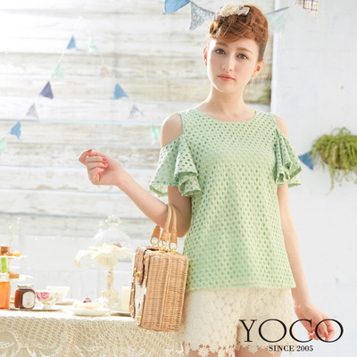 東京著衣-YOCO 鏤空蕾絲荷葉袖挖肩上衣-S.M(共三色)