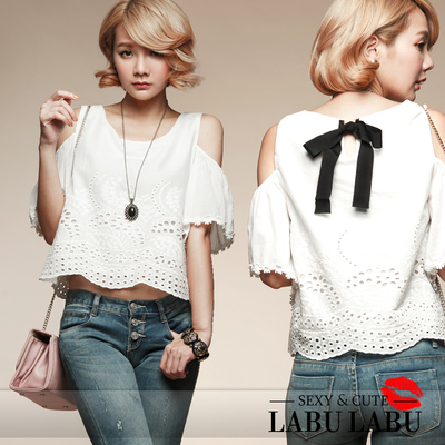 LABU LABU U領挖肩後綁結緹花擺棉質短版上衣