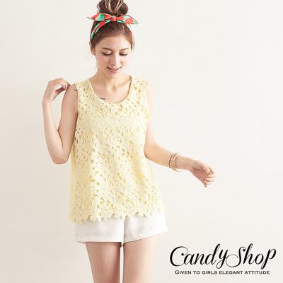 CANDY小舖 正韓國外罩緹花蕾絲片雙層背心(鵝黃)商品網址: