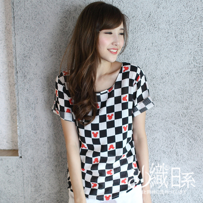 卡通印圖方格雪紡上衣(黑白方格)-沙織日系