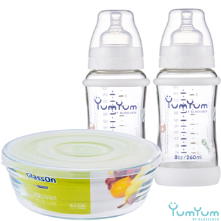【Glasslock YumYum】嬰幼哺育3件組 - 安全防摔玻璃奶瓶+微波盒
