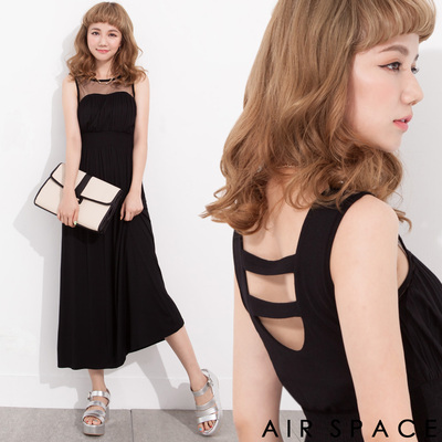 AIR SPACE 薄紗拼接背鏤空縮腰長洋裝(魅惑黑)商品網址: