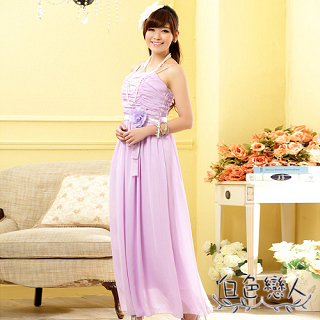 【白色戀人中大尺碼】紫色抓皺花朵長版雪紡晚禮服