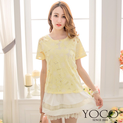 東京著衣-YOCO 透視花罩衫+縮腰拼接背心-S.M(共二色)-4014105