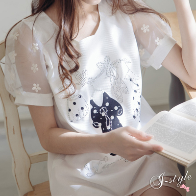 銀貼鑽點點衣櫥小花透紗袖上衣(共二色)-I-sTyLe