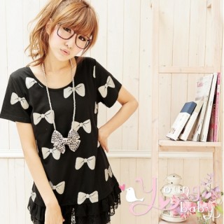 【YOUNGBABY中大碼】滿版蝴蝶結雙層雪紡襬長版上衣(共2色)