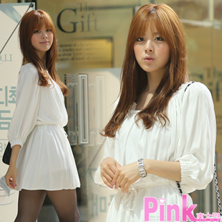 【預購-Pink東大門】輕盈動人˙V彈性領口抓皺綁帶洋裝(共二色)