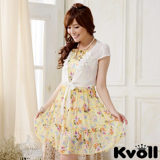 【KVOLL大尺碼】黃色雪紡碎花洋裝+小外套兩件式