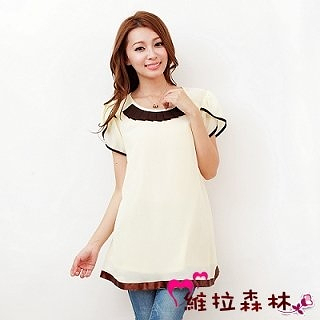 【維拉森林中大尺碼】杏色配色壓摺衣領雪紡上衣