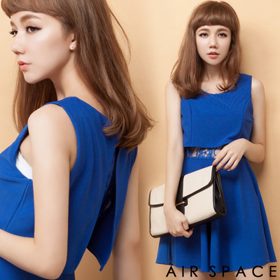 AIR SPACE 拼接蕾絲內裡後開衩傘狀洋裝(獨特藍)