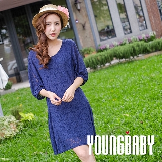 【YOUNGBABY中大碼】正韓 蕾絲縮口袖傘洋裝(藍紫)