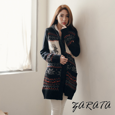 【ZARATA】內刷毛排釦連帽麋鹿針織長版厚外套(黑色)