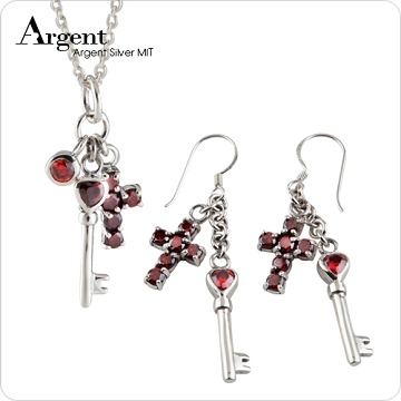【ARGENT銀飾】晶鑽系列「十字心鑰(紅)」純銀項鍊+耳環(套組)