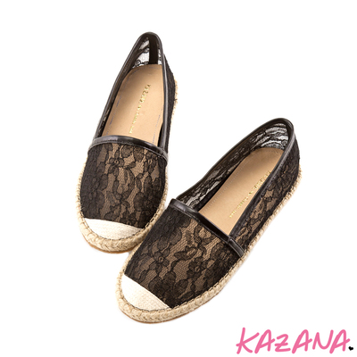 KAZANA巴黎小性感-精緻蕾絲休閒麻編便鞋 花朵蕾絲黑