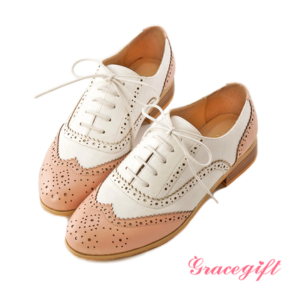 Grace gift遇見新英倫~雕花繫帶復古撞色牛津平底鞋 粉商品網址: