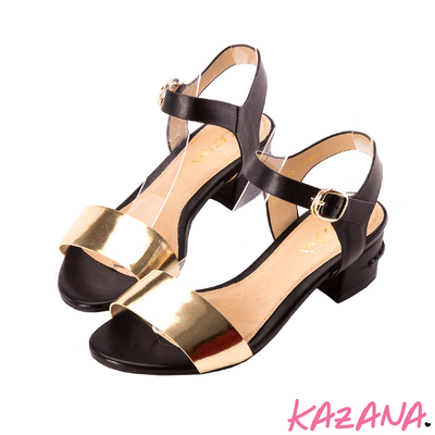 KAZANA復古涼夏-寬版簡約一字撞色粗跟涼鞋 金