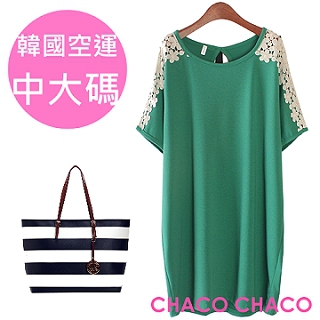 【預購CHACO PLUS】韓製雙袖勾花背後開孔蝴蝶結短袖長版衫1068(2色L-XL)