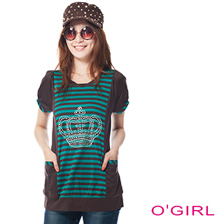 【OGIRL】華麗珠鑽造型絲光棉雙口袋休閒上衣(綠咖條)