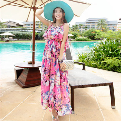 波西米亞荷葉碎花海邊度假雪紡吊帶長洋裝(玫紅色)-Joli-neon商品網址: